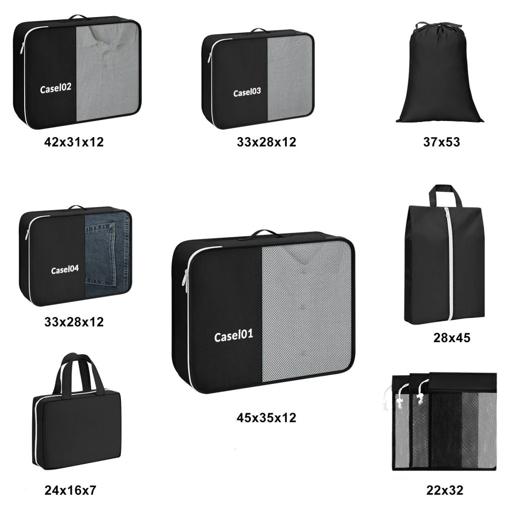 10-dielna praktická sada organizérov na oblečenie, kozmetiku, nabíjačky atď., vďaka ktorej budete mať v kufri všetko prehľadne usporiadané. Rôzne veľkosti obalov umožňujú veľkú variabilitu využitia.