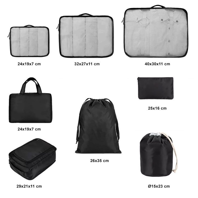 8-dielna praktická sada organizérov na oblečenie a kozmetiku, vďaka ktorej budete mať v kufri všetko prehľadne usporiadané. Rôzne veľkosti obalov umožňujú veľkú variabilitu využitia.